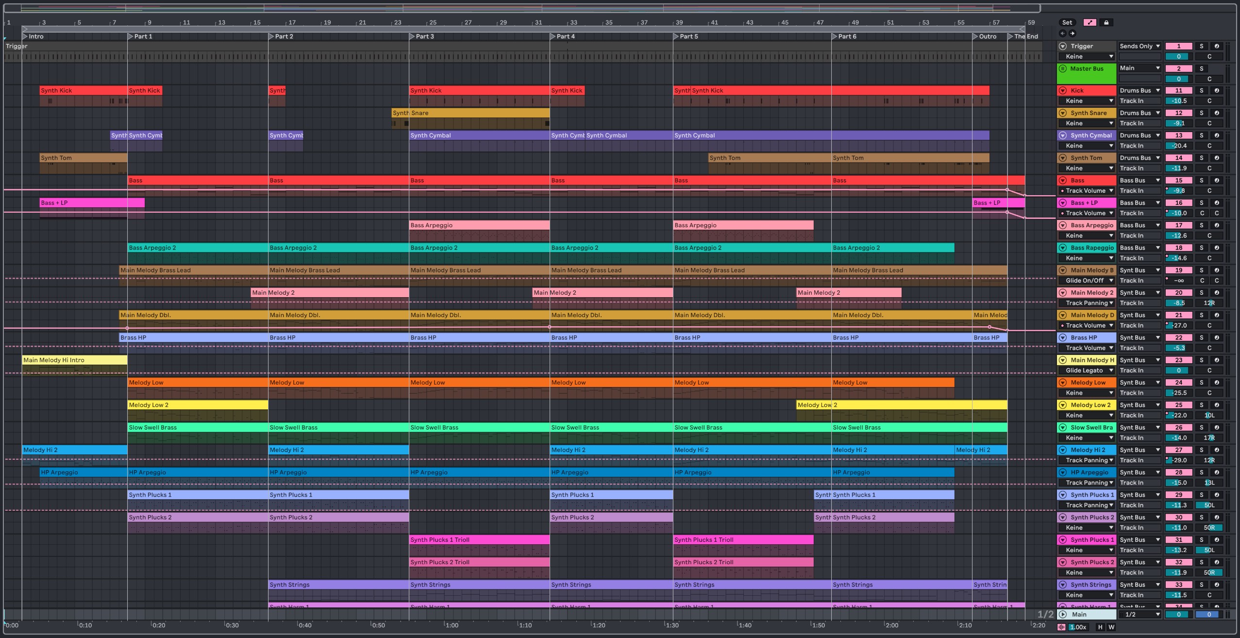 | Automatisierung: Kann durch Drücken von A in der Arrangement-Fensteransicht angezeigt werden. Die meisten Spuren verfügen über eine Automatisierung, einschließlich Filter-Cutoffs, FX-Sends usw. | ||